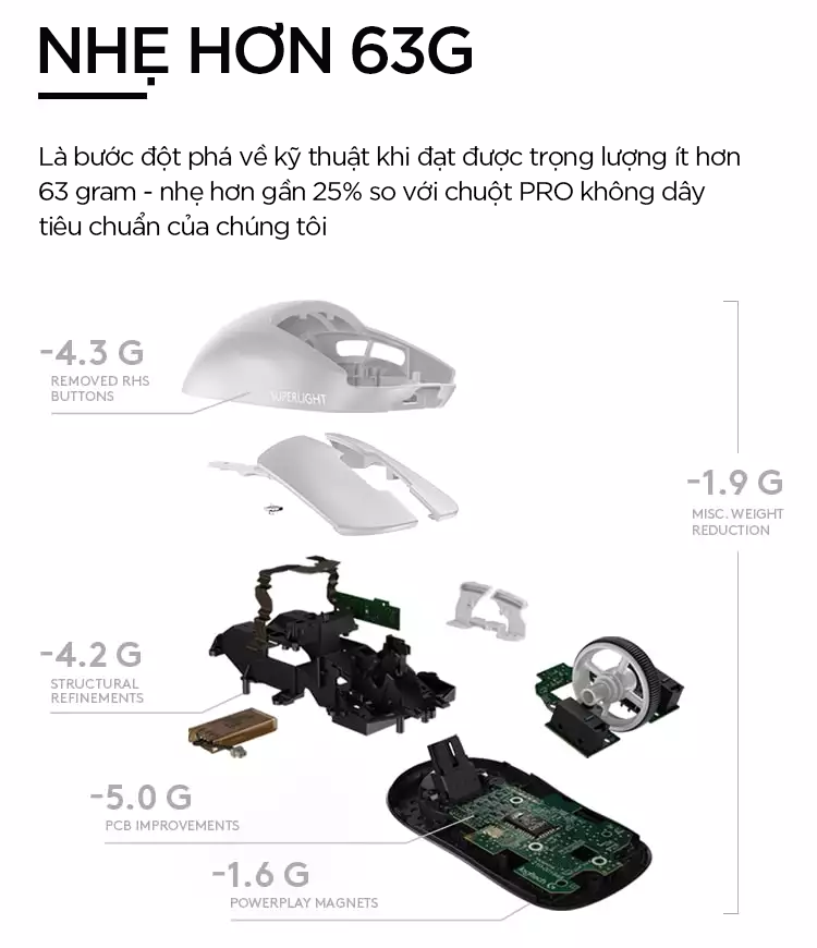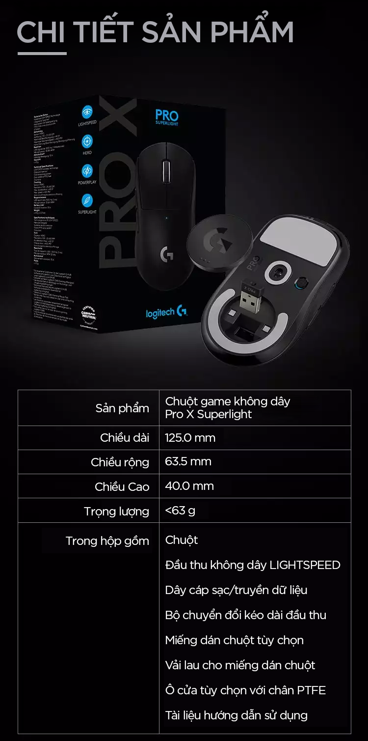 Chuột không dây gaming Logitech G Pro X - Super Light có được thiết kế tỉ mỉ và nhỏ gọn khi chỉ nặng tầm 63g, với kích thước 12.5 x 6.35 x 4 cm, giúp người dùng có thể dễ dàng đem nó theo bên mình đến mọi nơi để phục vụ cho công việc và các hoạt động giải trí như chơi game.