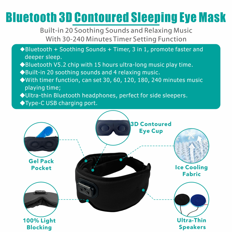 8. Vị trí của tai nghe trong mặt nạ mắt có thể điều chỉnh được và mặt nạ mắt có dây đeo điều chỉnh đàn hồi có thể thích ứng với hầu hết mọi kích cỡ đầu . Tai nghe có thể tháo rời để dễ dàng vệ sinh mặt nạ mắt;
